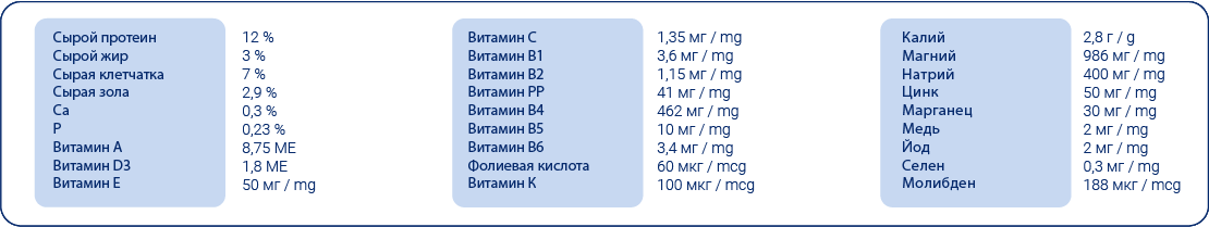 СОСТАВ: кукуруза, пшеница, ячмень, овес, люцерна, шрот подсолнечный, пшеничная мука, меласса свекловичная, жом свекловичный, отруби ржаные, морковь, свекла, ядро подсолнечника, семечки с лузгой, шрот кэроба, цветки календулы, цветки ромашки, витаминно-минеральный комплекс, мел, краситель.